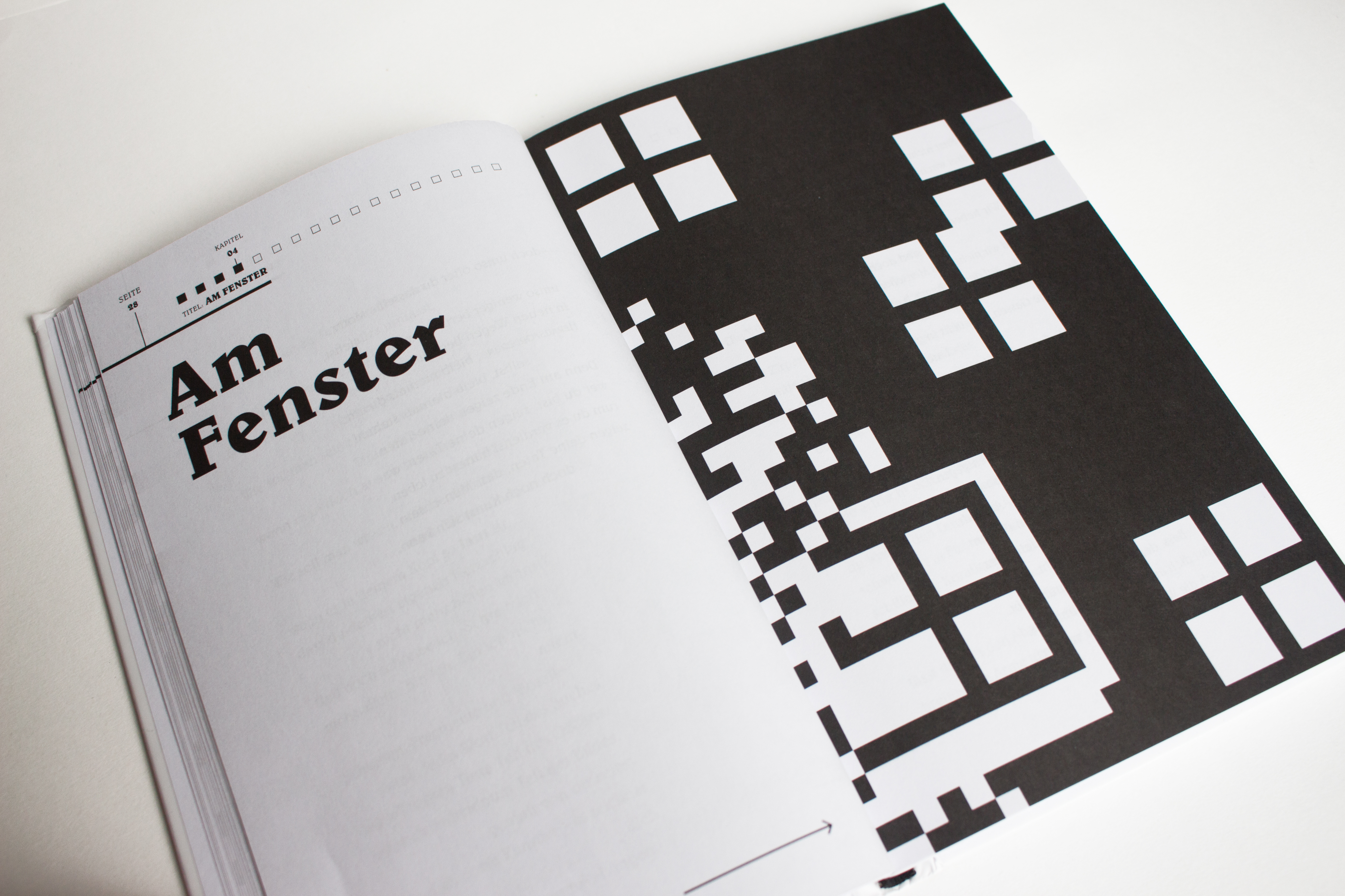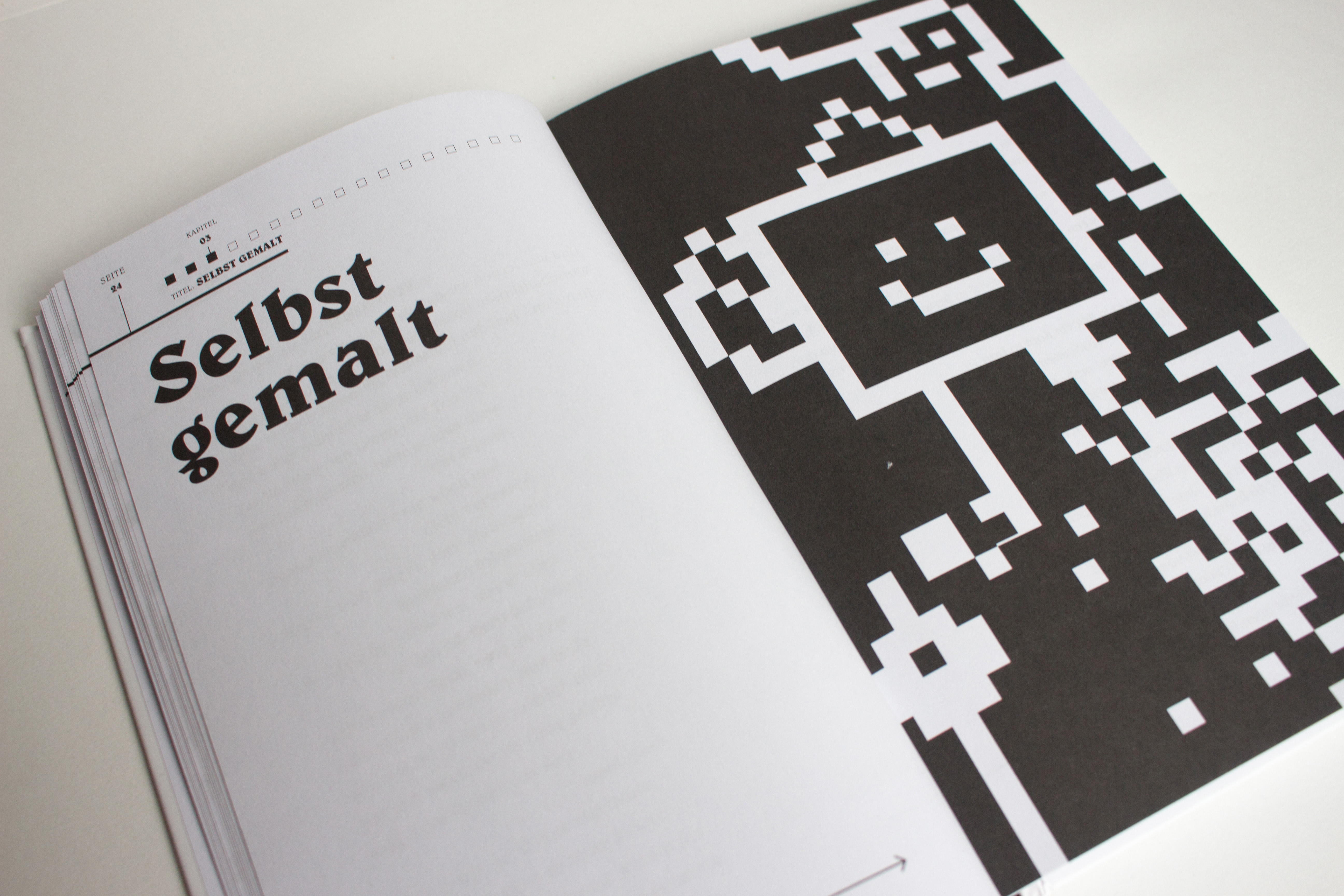 Schwarz Weiß, selbst designte QR Codes, Text. Mehr braucht es nicht damit dieses Buch wirkt.